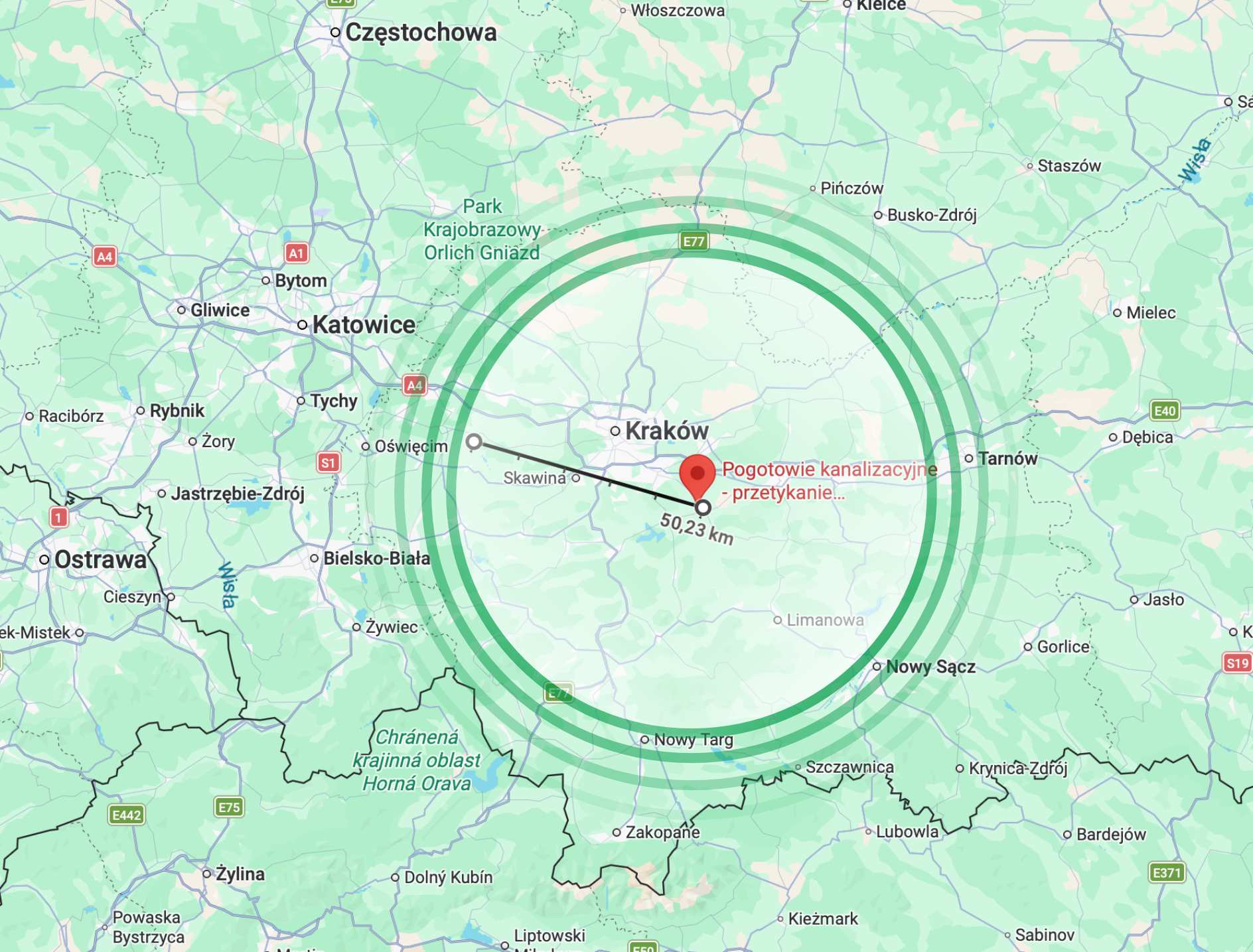 Obszar działania pogotowia kanalizacyjnego (Wieliczka, Kraków, Małopolska)